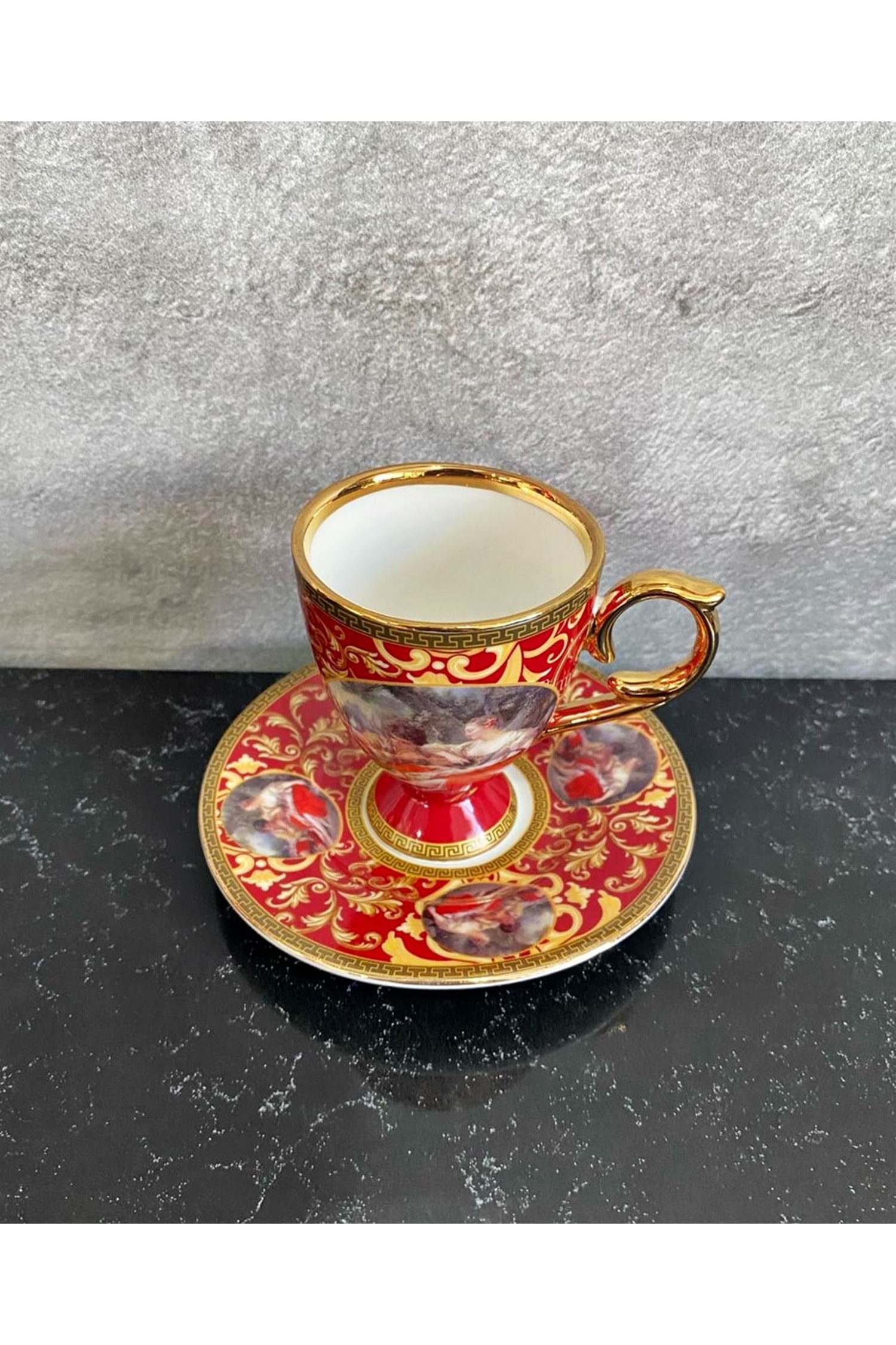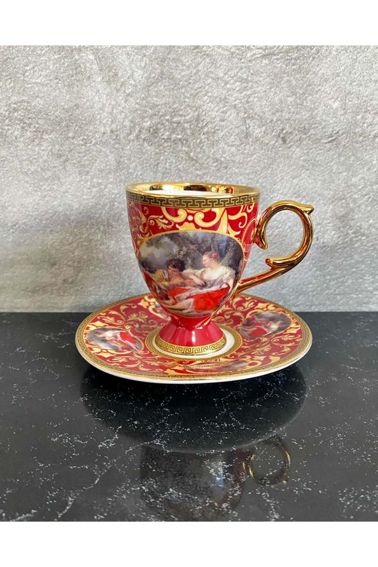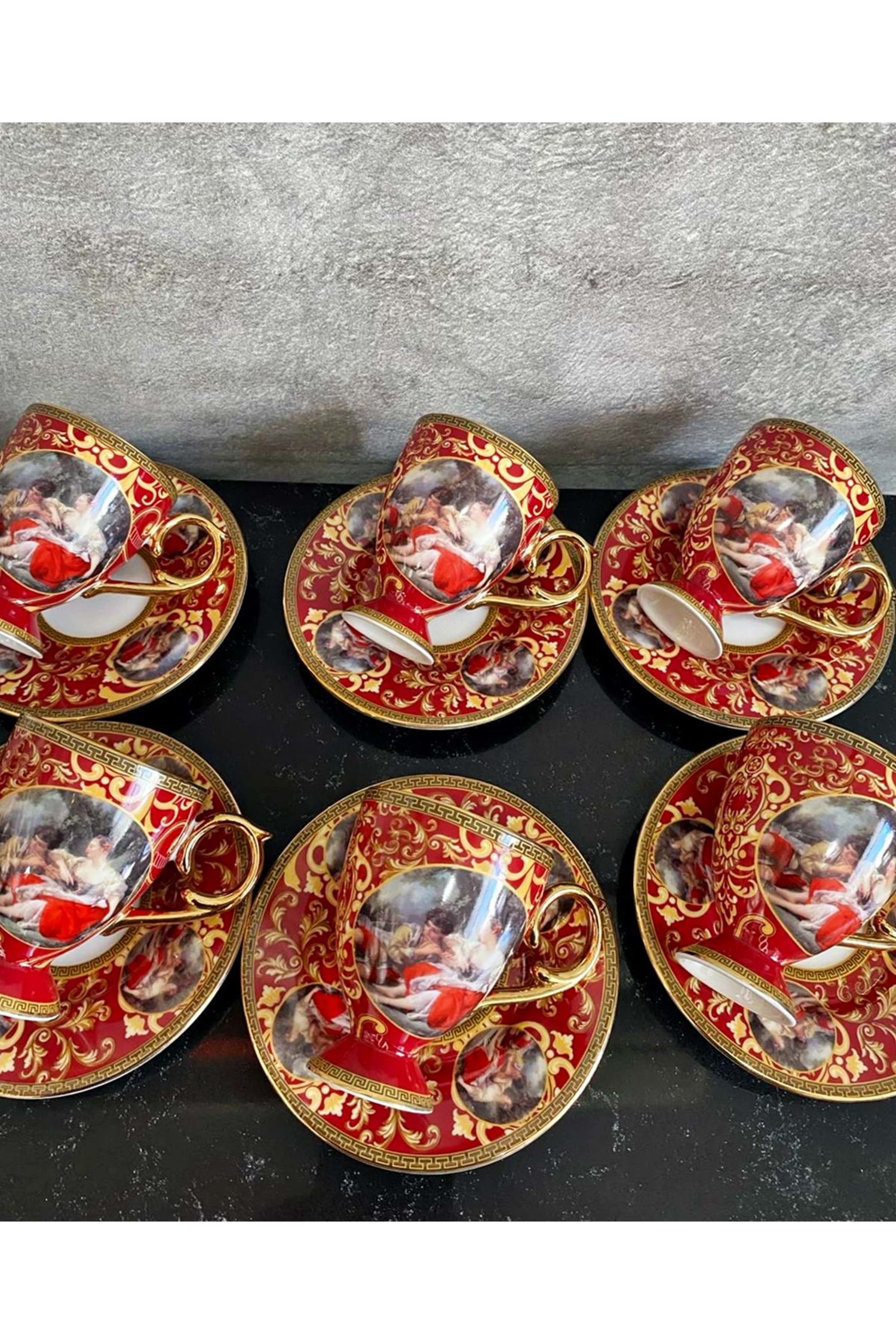 Kosova Vintage Viyana Kraliyet Tarzı Kırmızı Ve Altın Kahve Fincan Takımı 6'lı