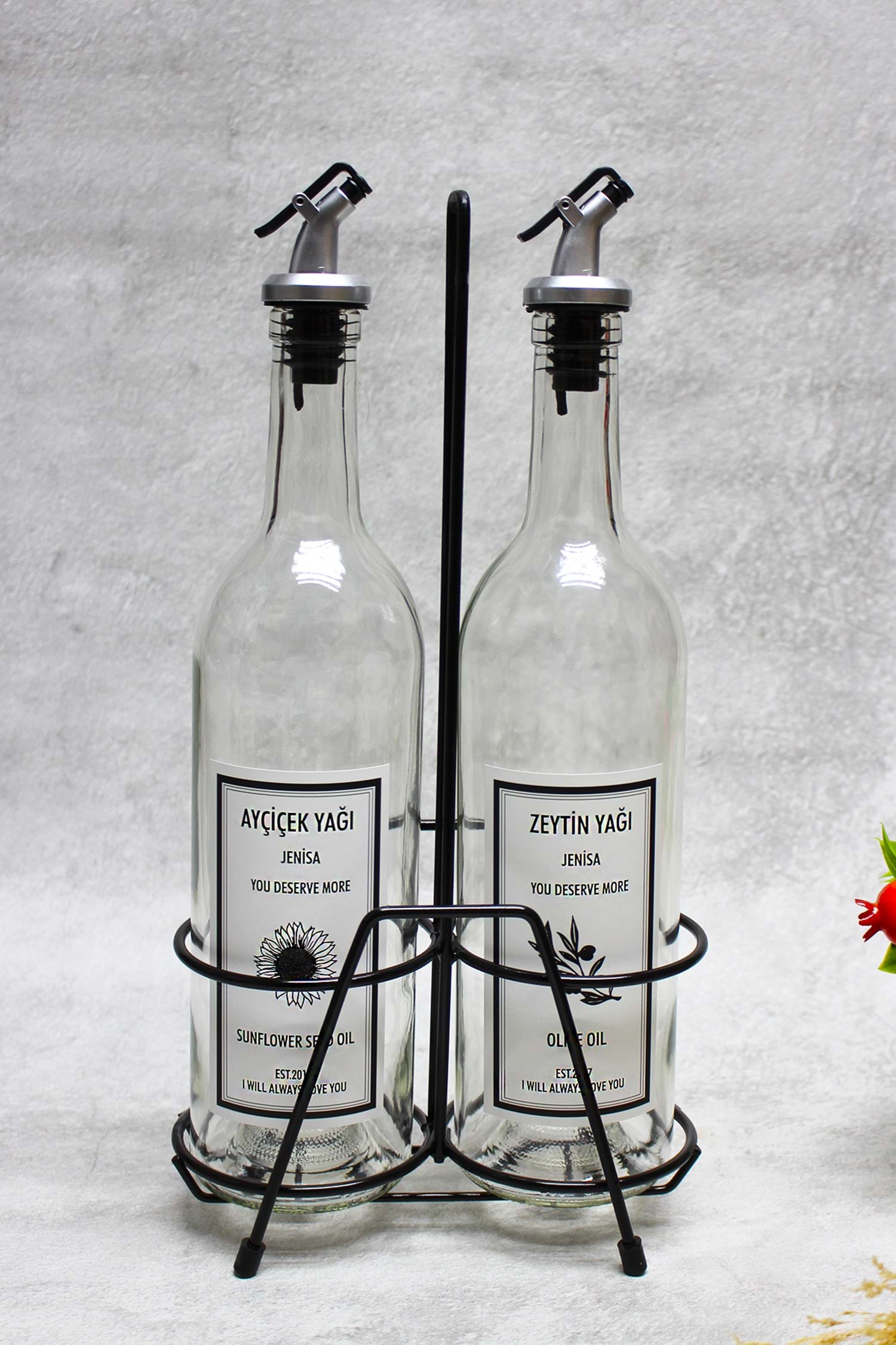 2 Adet Şeffaf 750 Ml Etiketli Akıtmaz Yağdanlık Yağlık Ve Siyah Stant