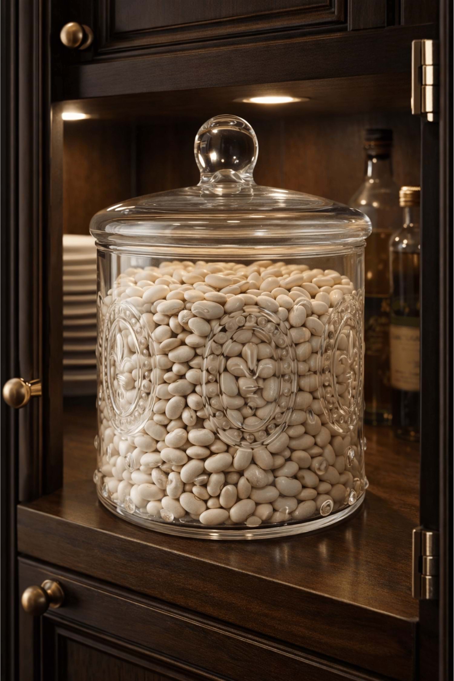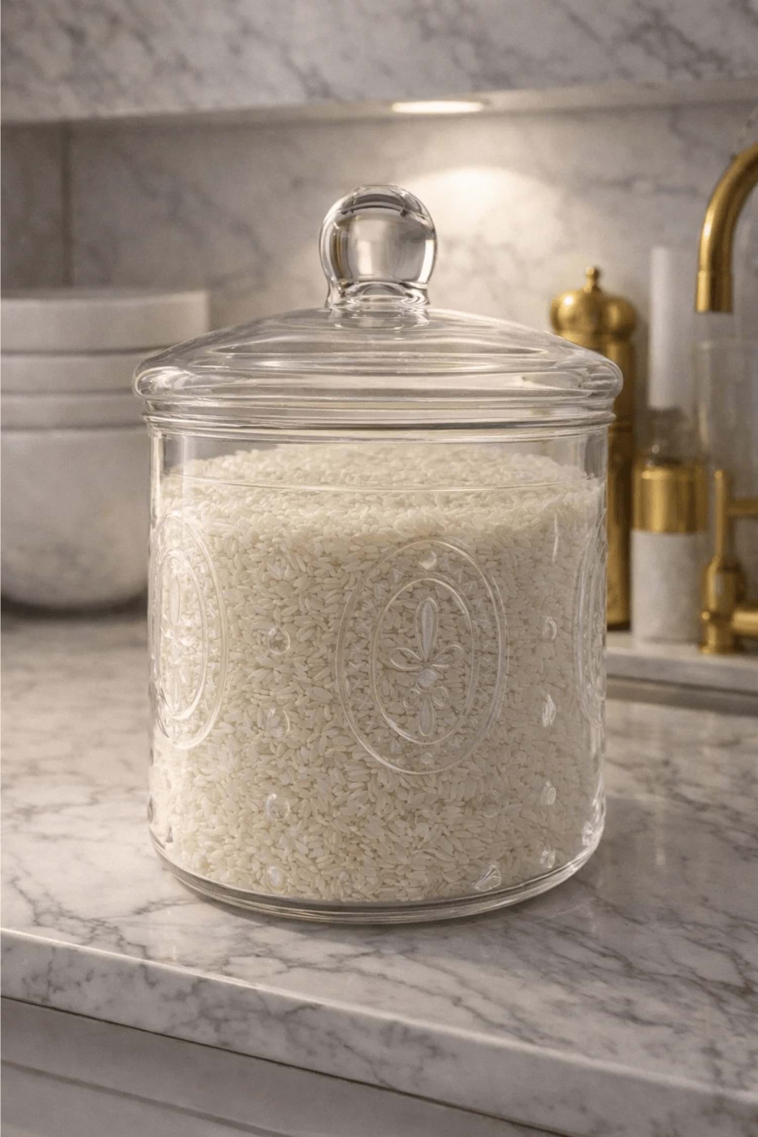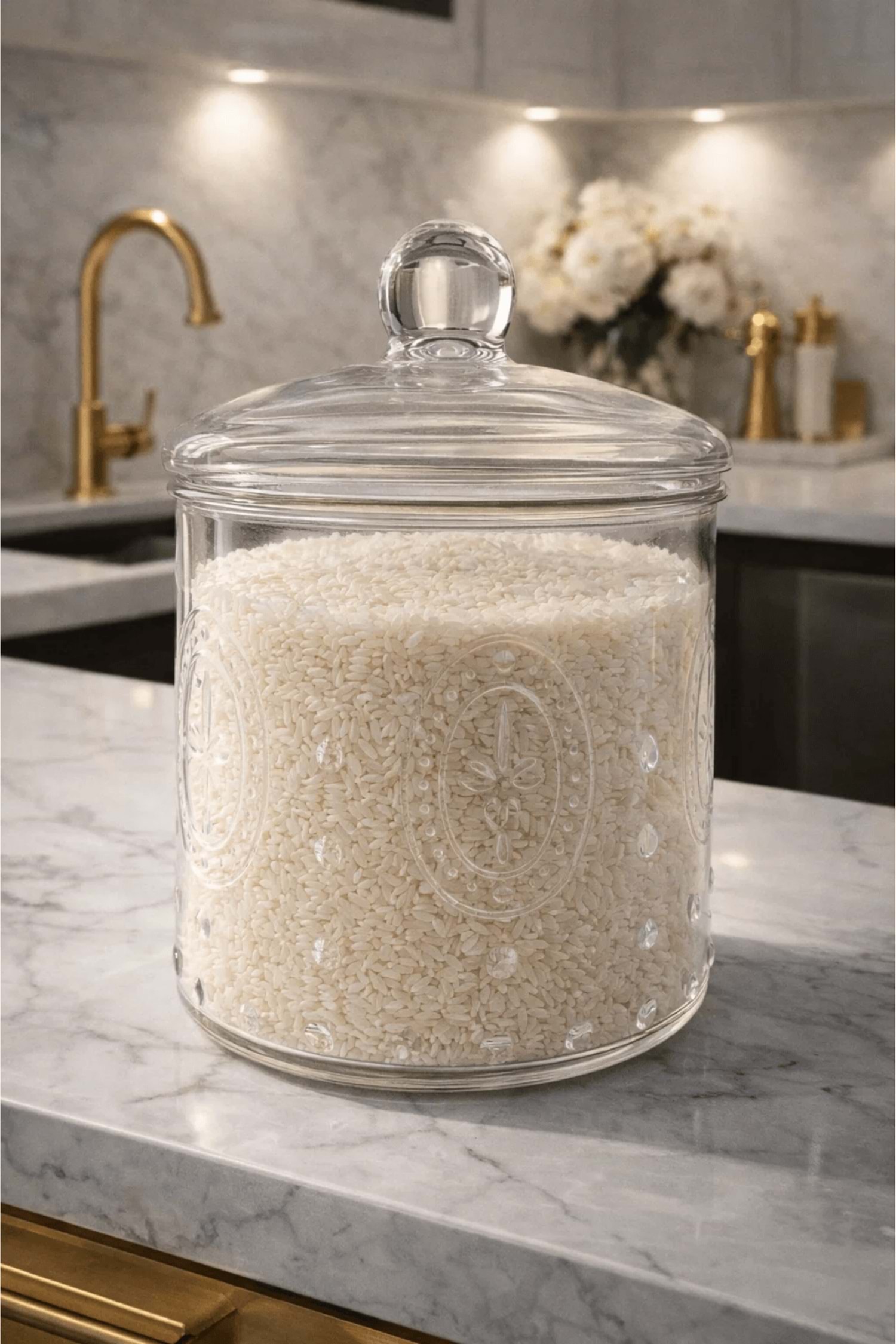 Yüksek kaliteli şeffaf cam gövdesi, içeriğini net şekilde görmenizi sağlarken; üzerindeki zarif desen detayları mutfağınıza dekoratif bir dokunuş katar. Cam kapaklı yapısı sayesinde bakliyat, pirinç, makarna, kahve, şeker, kuruyemiş ve benzeri gıdaları hijyenik şekilde muhafaza etmenize yardımcı olur.