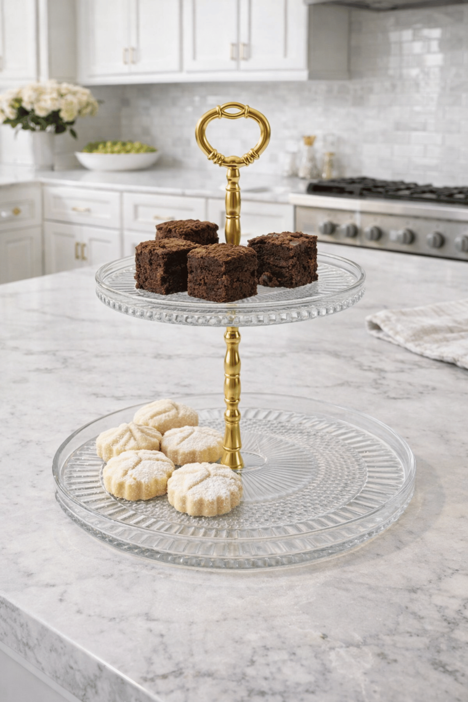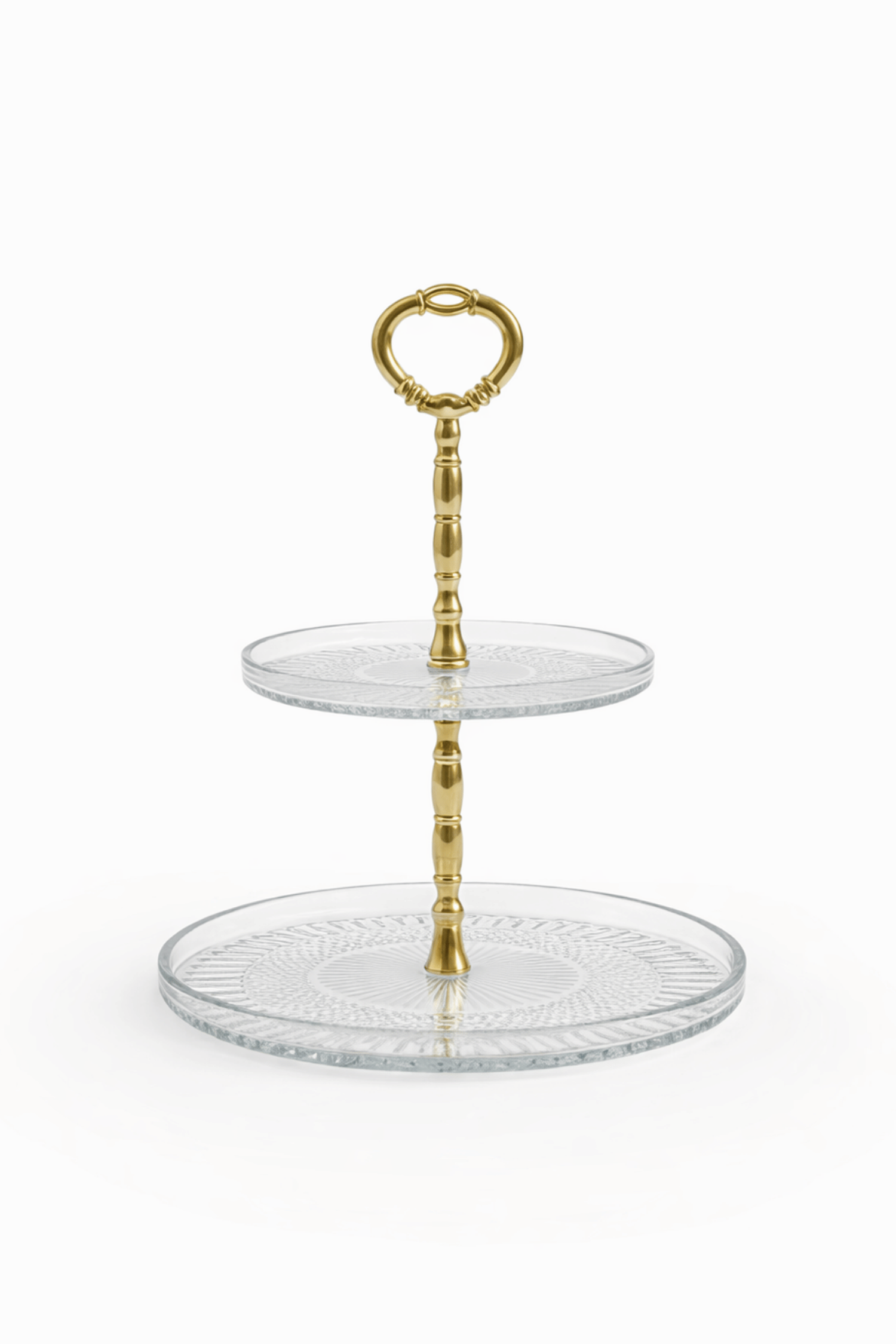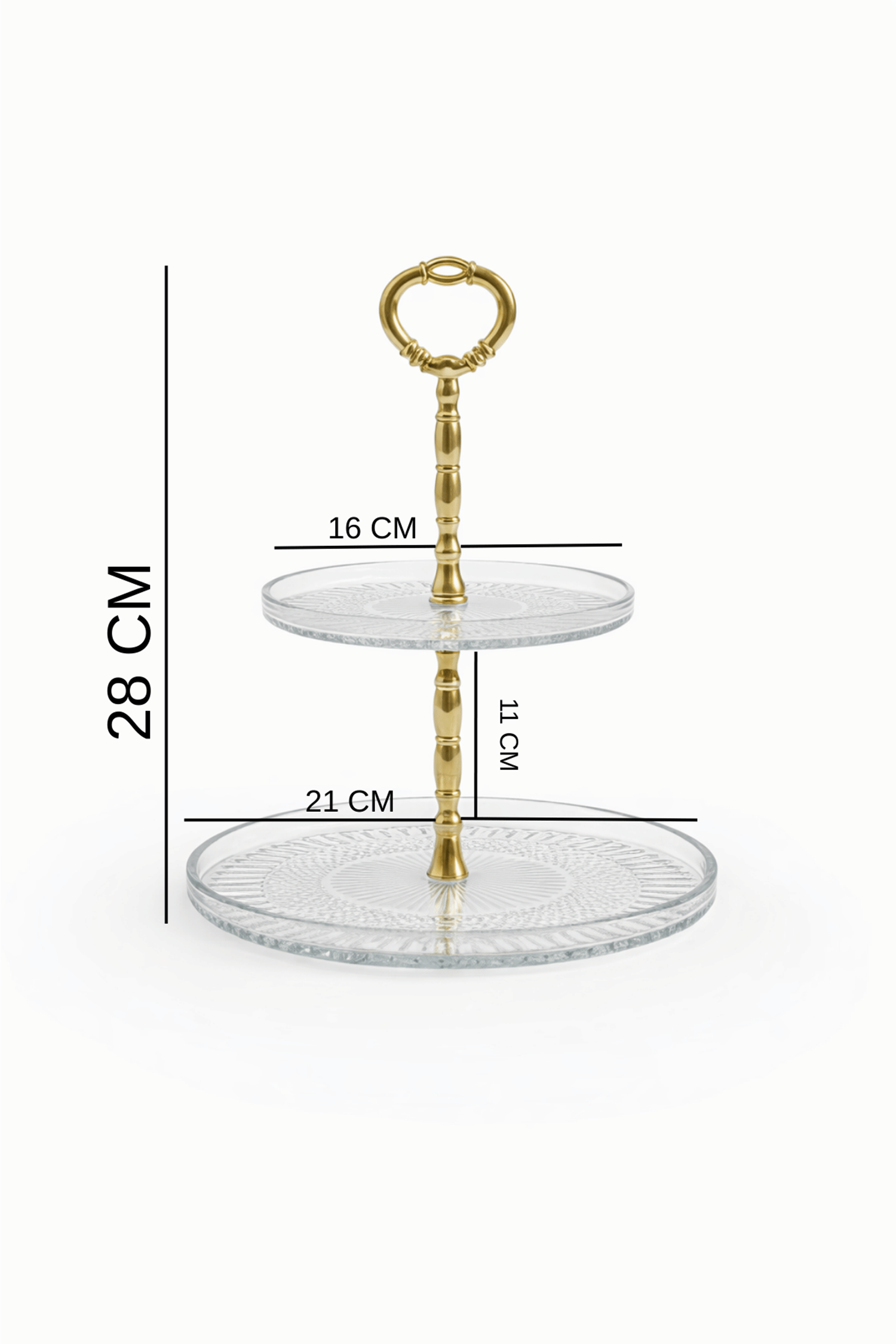 Zarif cam dokusu ve gold renkli kulp detayıyla sofralarınıza şıklık katan 2 katlı cam sunum standı, kek, kurabiye ve tatlı sunumlarınız için ideal bir tercihtir. Şeffaf cam tabakları sayesinde sunulan ürünler net şekilde görünür, estetik ve düzenli bir sunum sağlar.