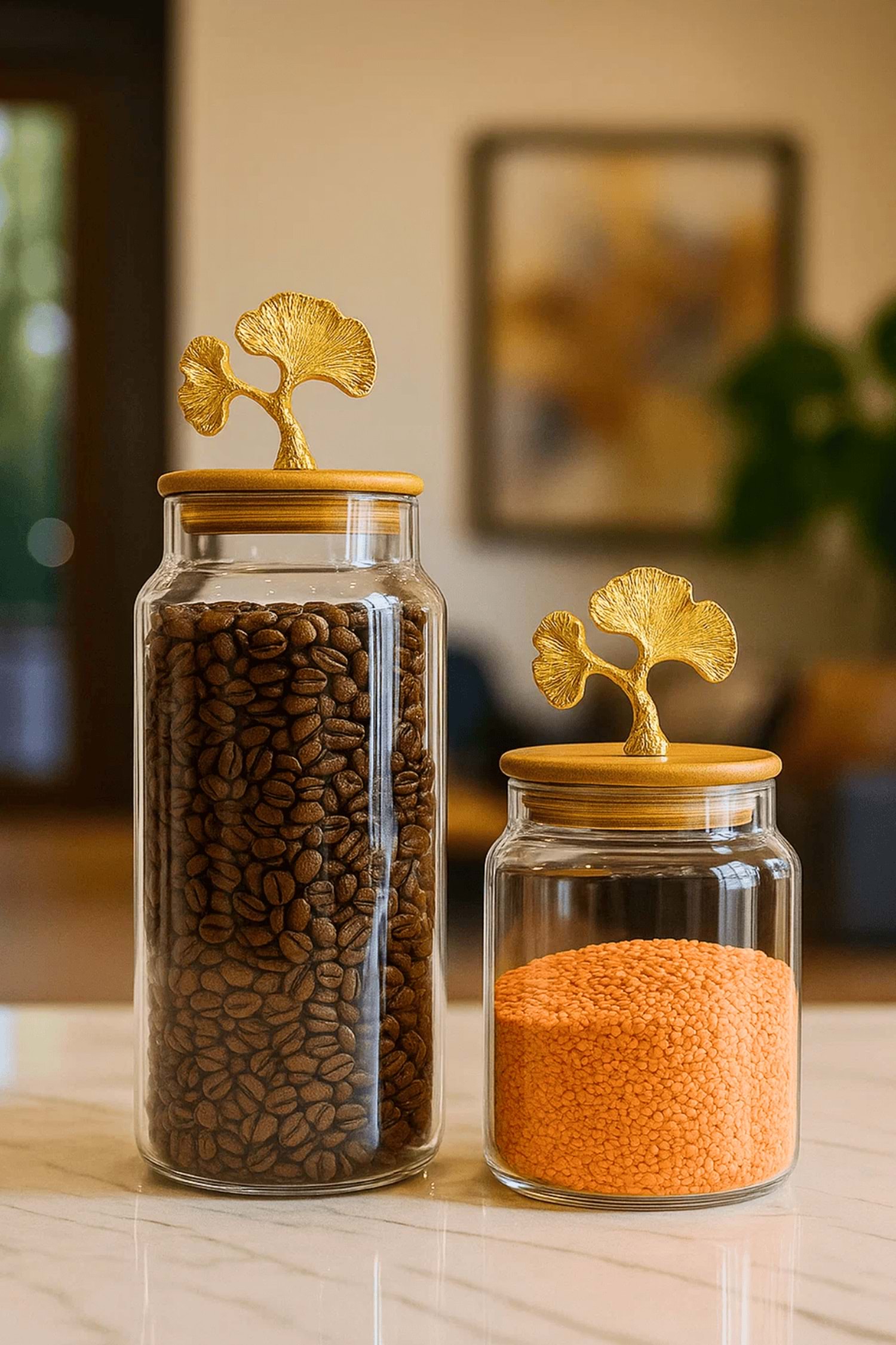 2’li Altın Metal Ginkgo Figürlü Bambu Kapaklı Cam Kavanoz – 1400 ml + 890 ml Şeffaf Saklama Kabı