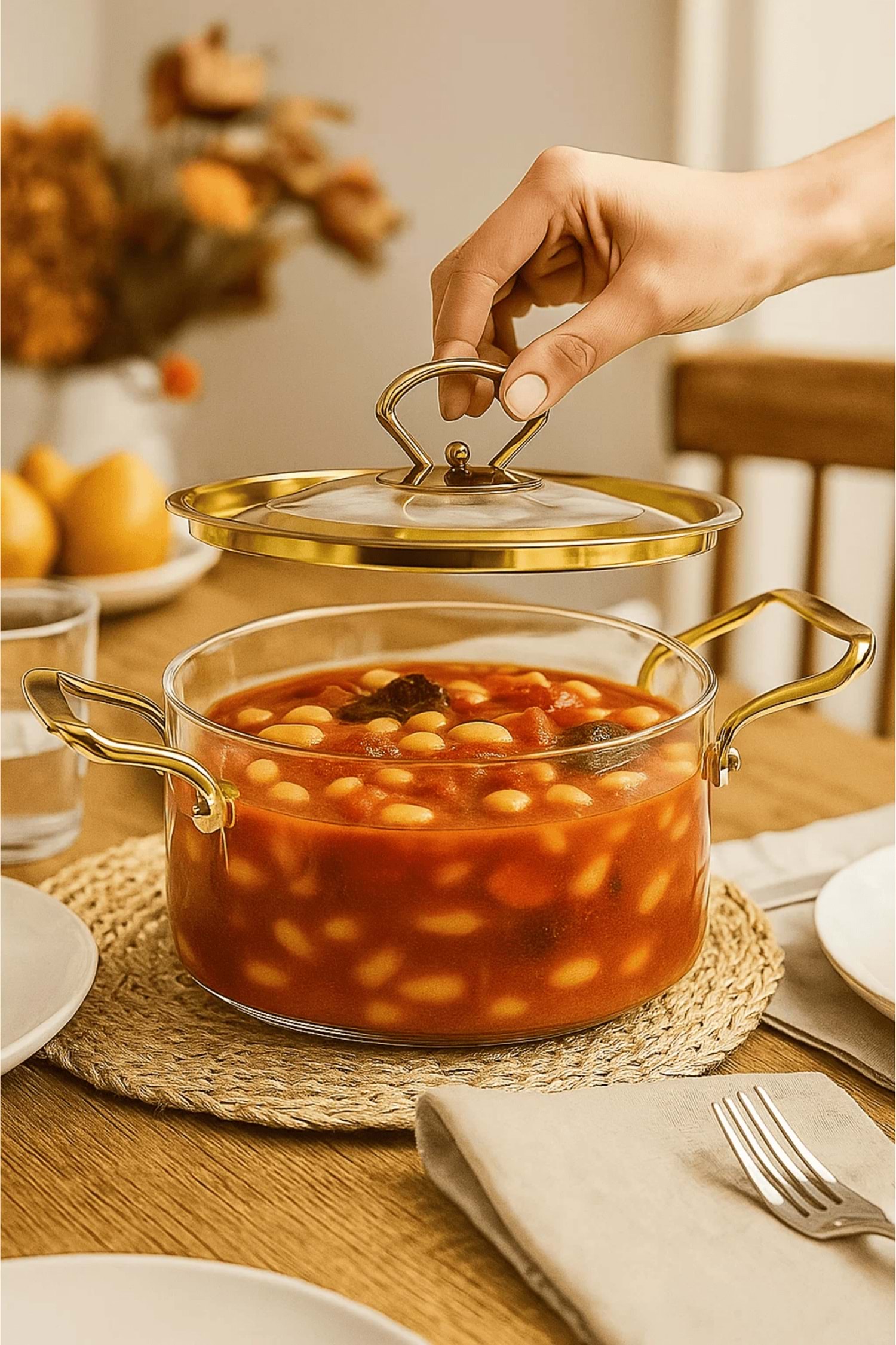 Şıklık ve dayanıklılığı bir arada sunan bu borosilikat cam tencere, mutfağınıza zarafet katarken yemek pişirme deneyiminizi de bir üst seviyeye taşır.