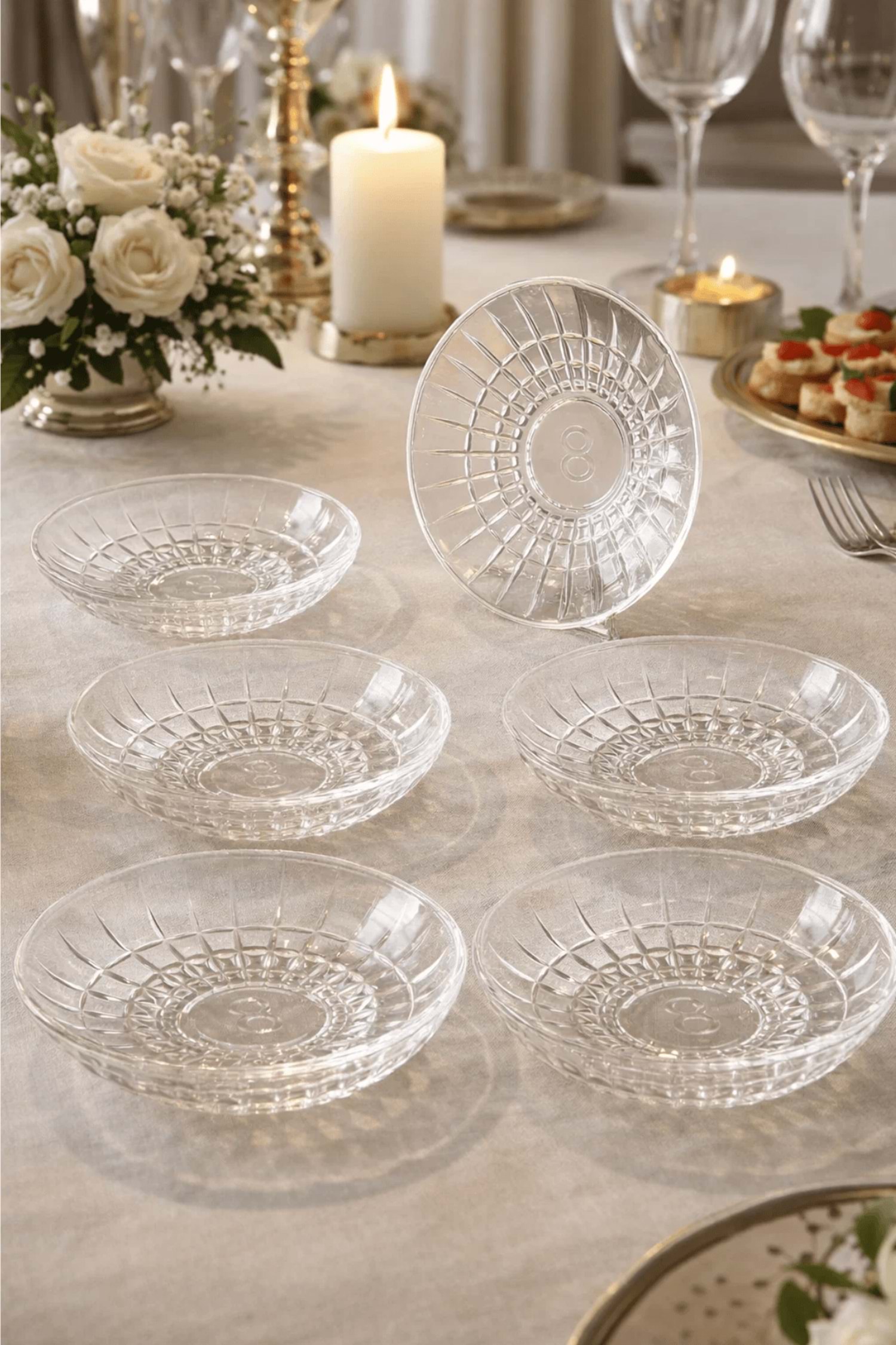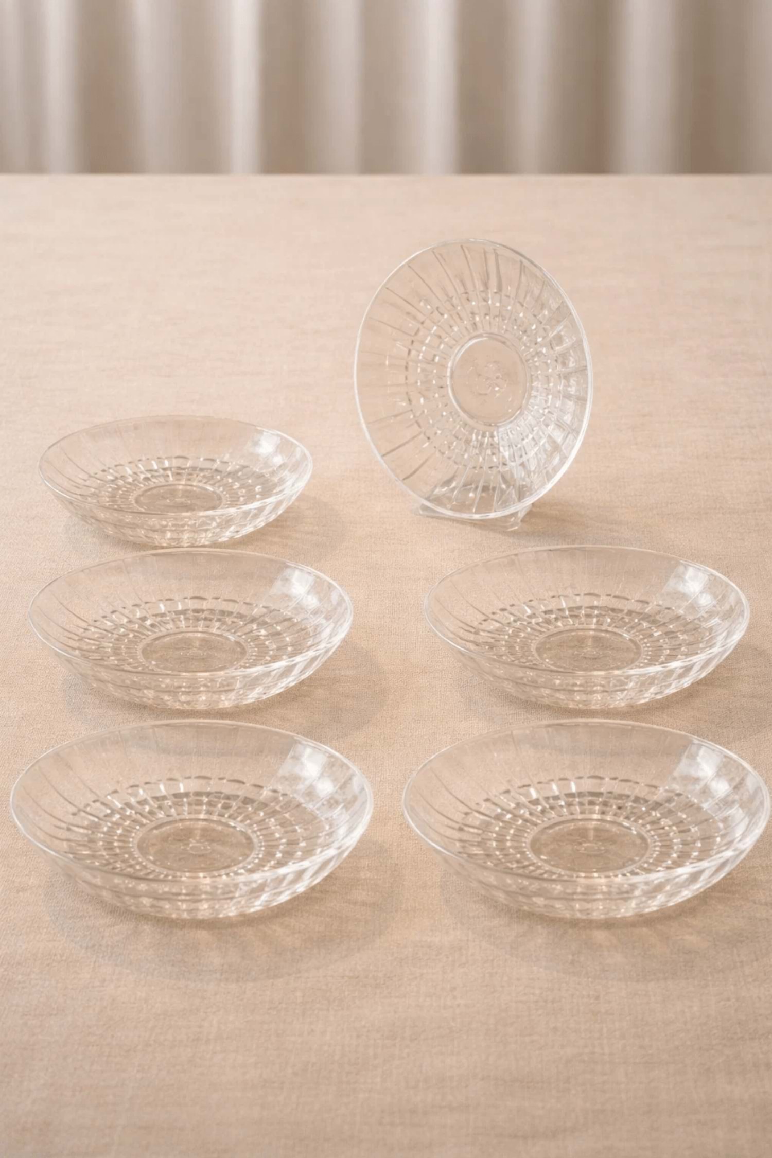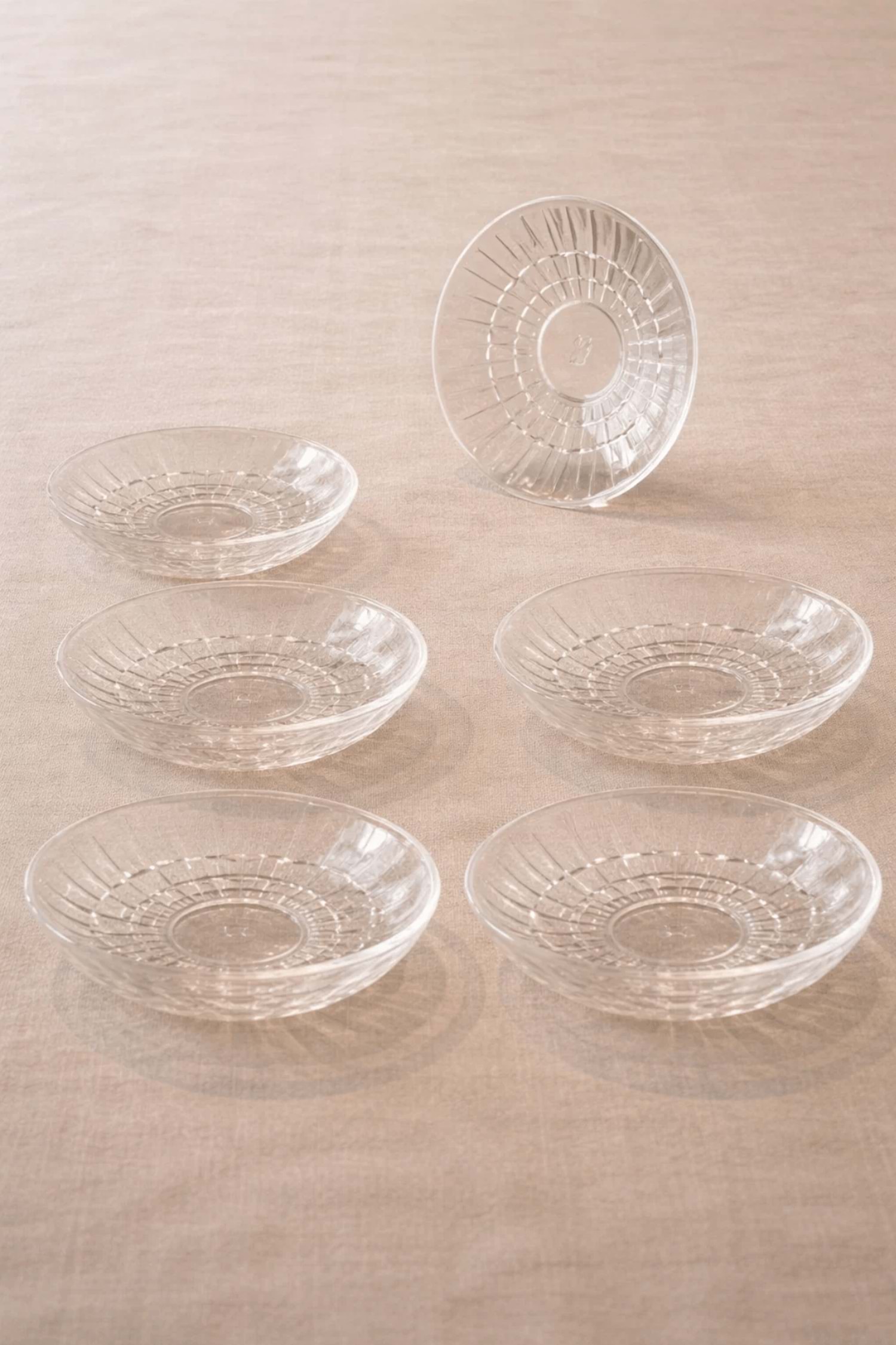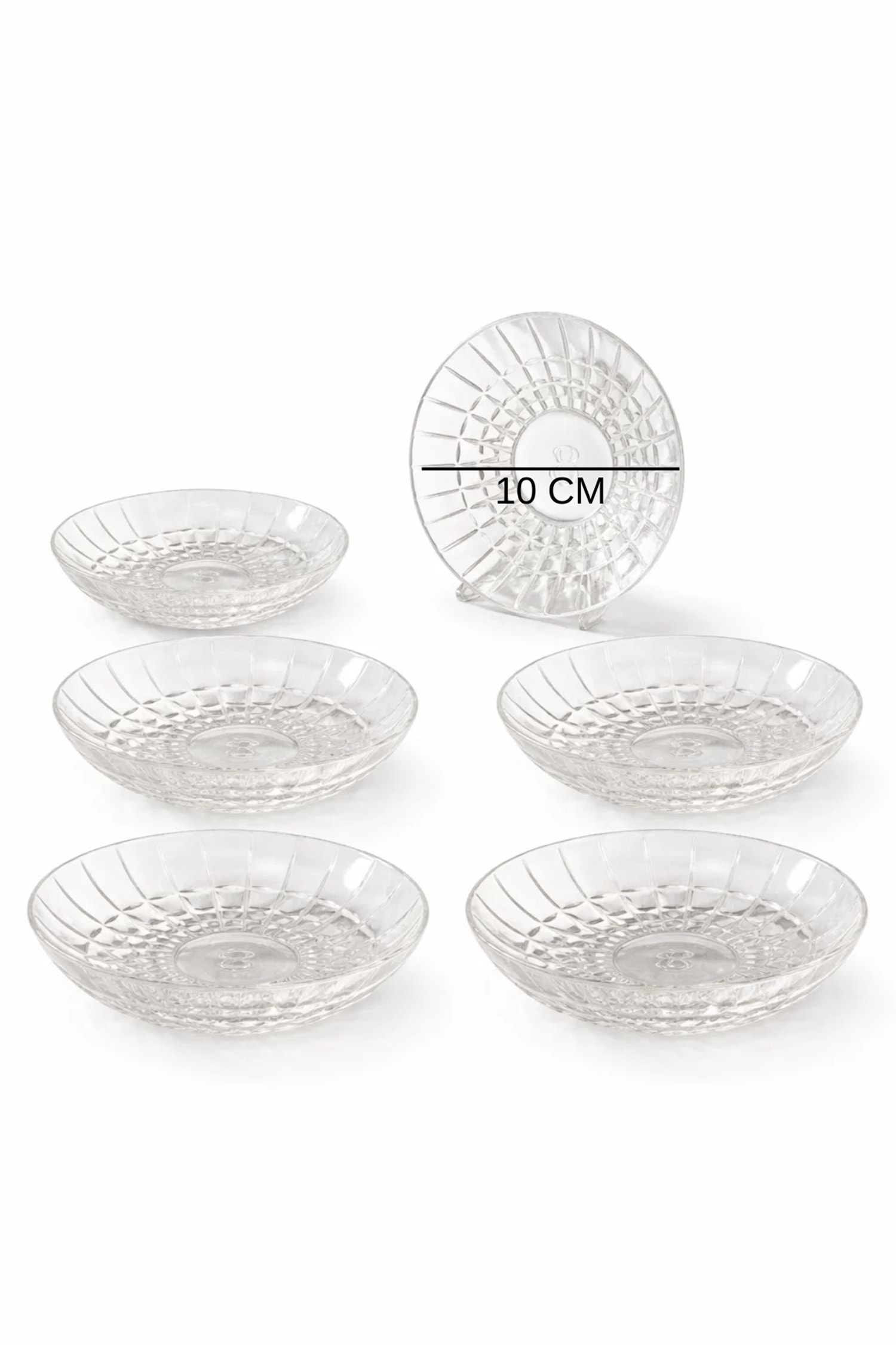 6’lı Bakara Desen Çay Tabağı – Kristal Kesme Şeffaf Cam Sunumluk