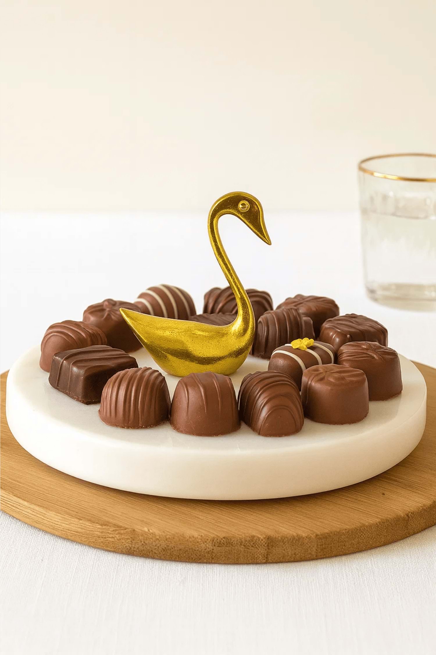 %100 doğal mermer taban üzerine yerleştirilmiş altın renk kuğu figürü, elit ve modern bir sunum oluştururken; lokum, çikolata, draje, kuruyemiş ve küçük atıştırmalıkları şık bir şekilde sergilemenizi sağlar.