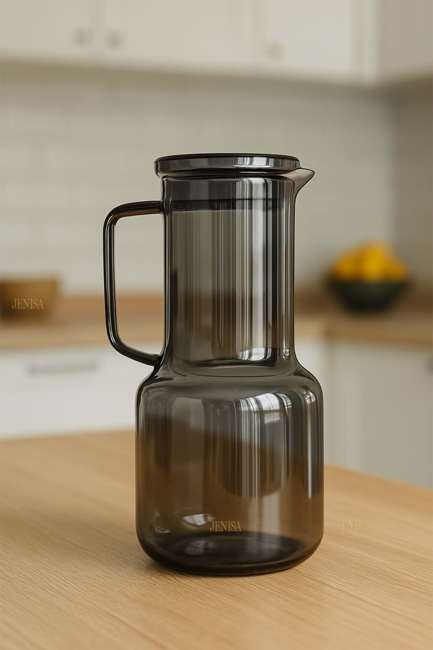 Isıya Dayanıklı Cam Sürahi 1.8 Litre – Füme Renk, Borosilikat, Süzgeçli Kapaklı