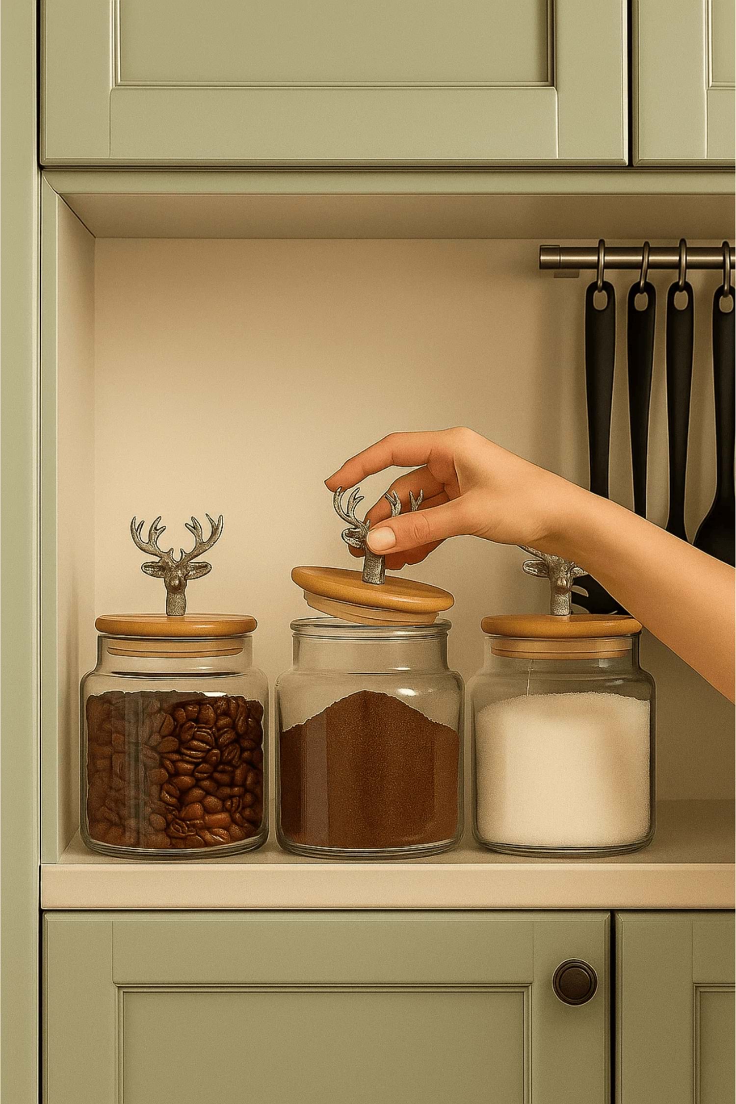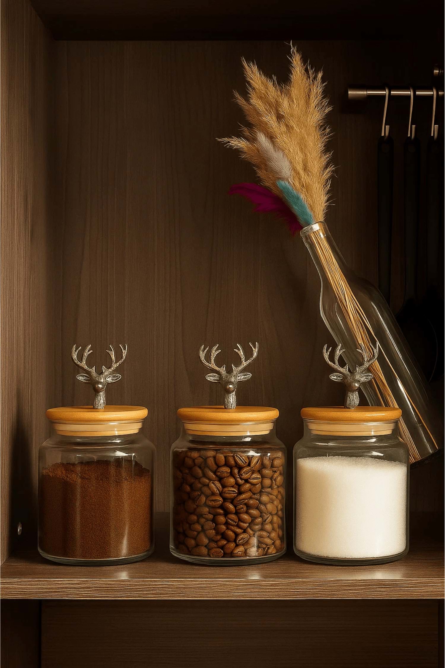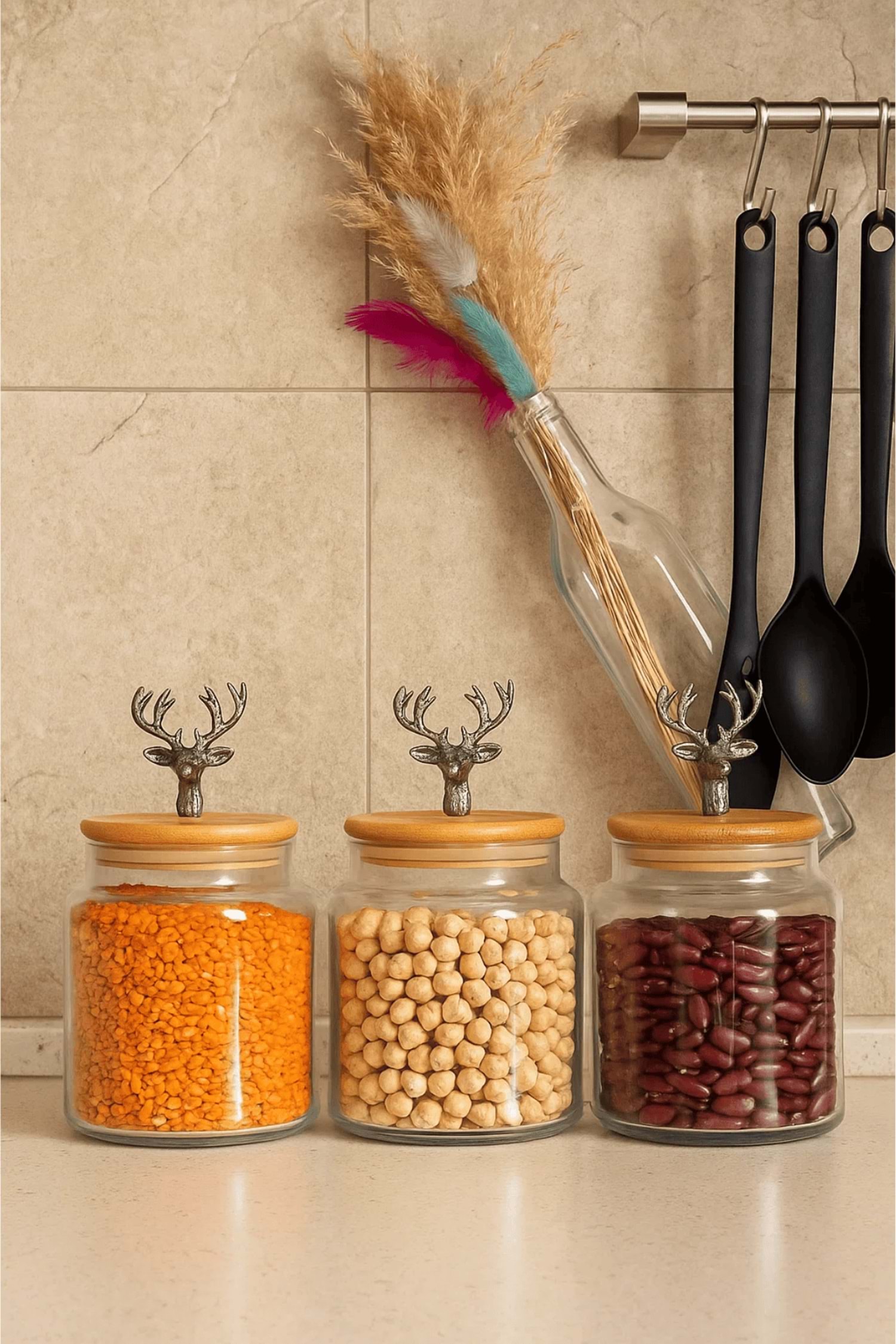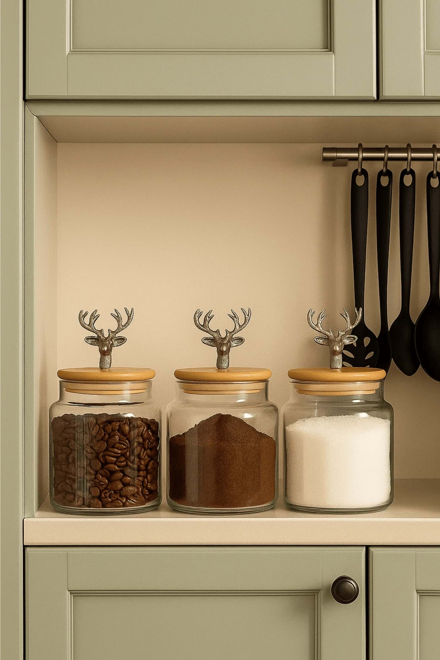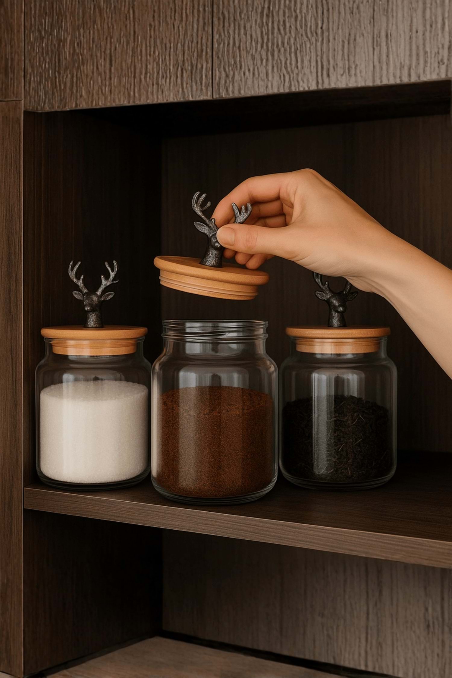 3'lü Metal Siyah Geyik Figürlü Bambu Kapaklı Cam Kavanoz – Şık Saklama Kabı 635 cc