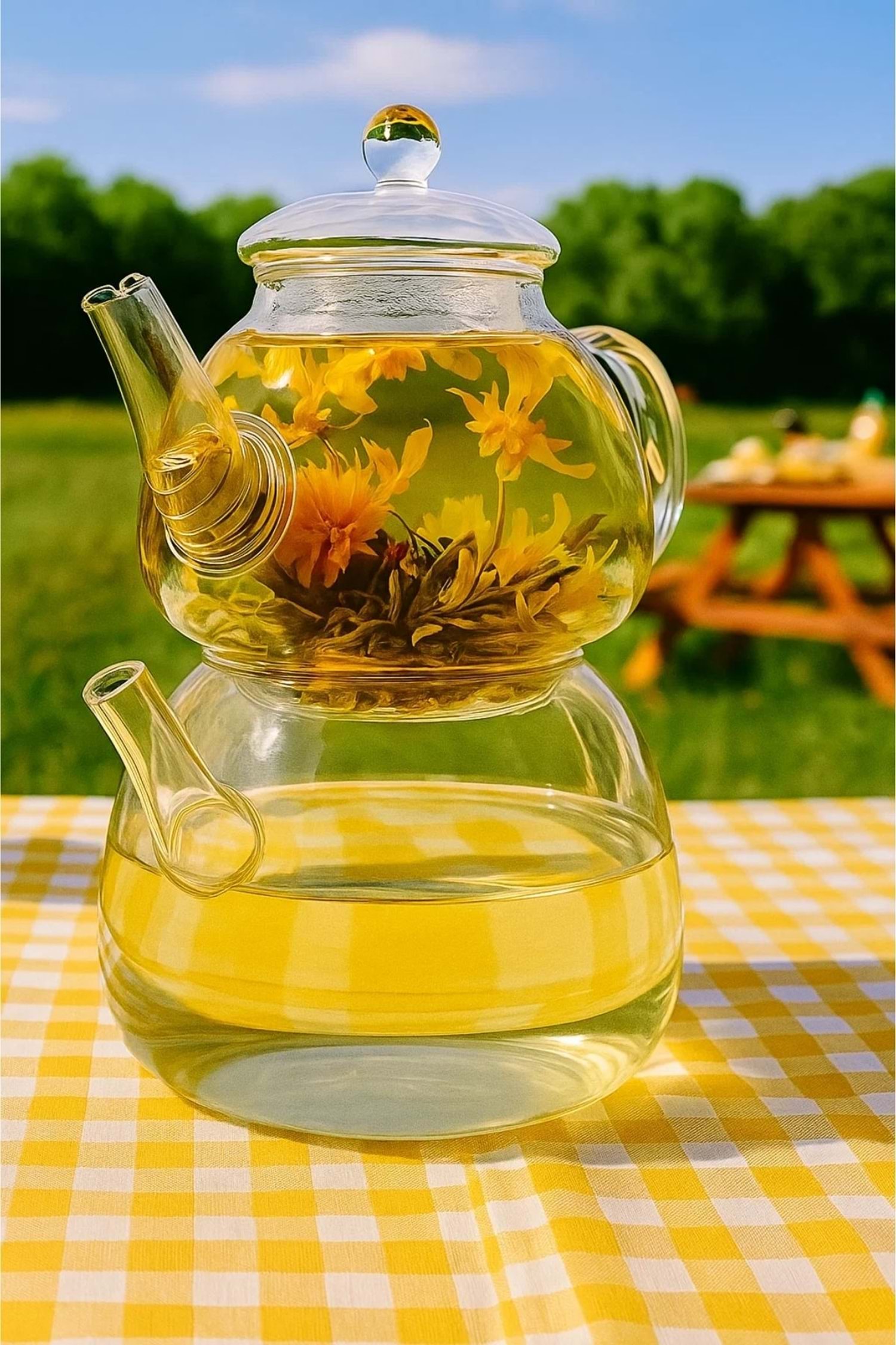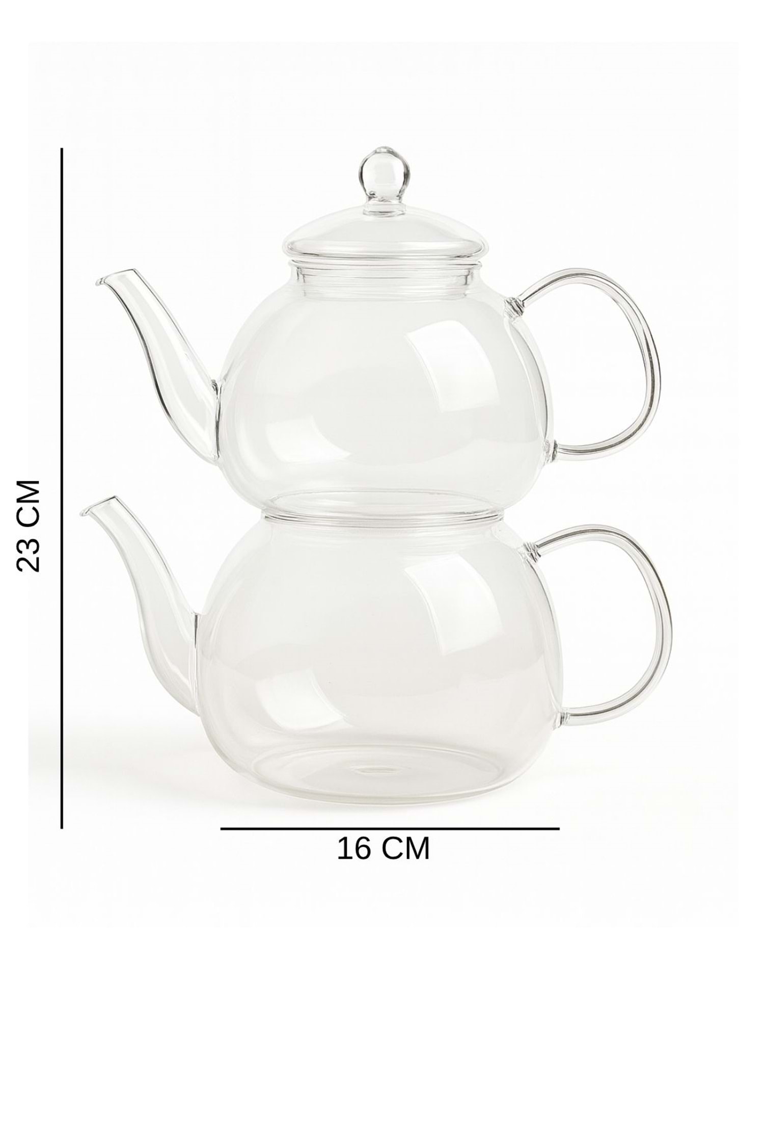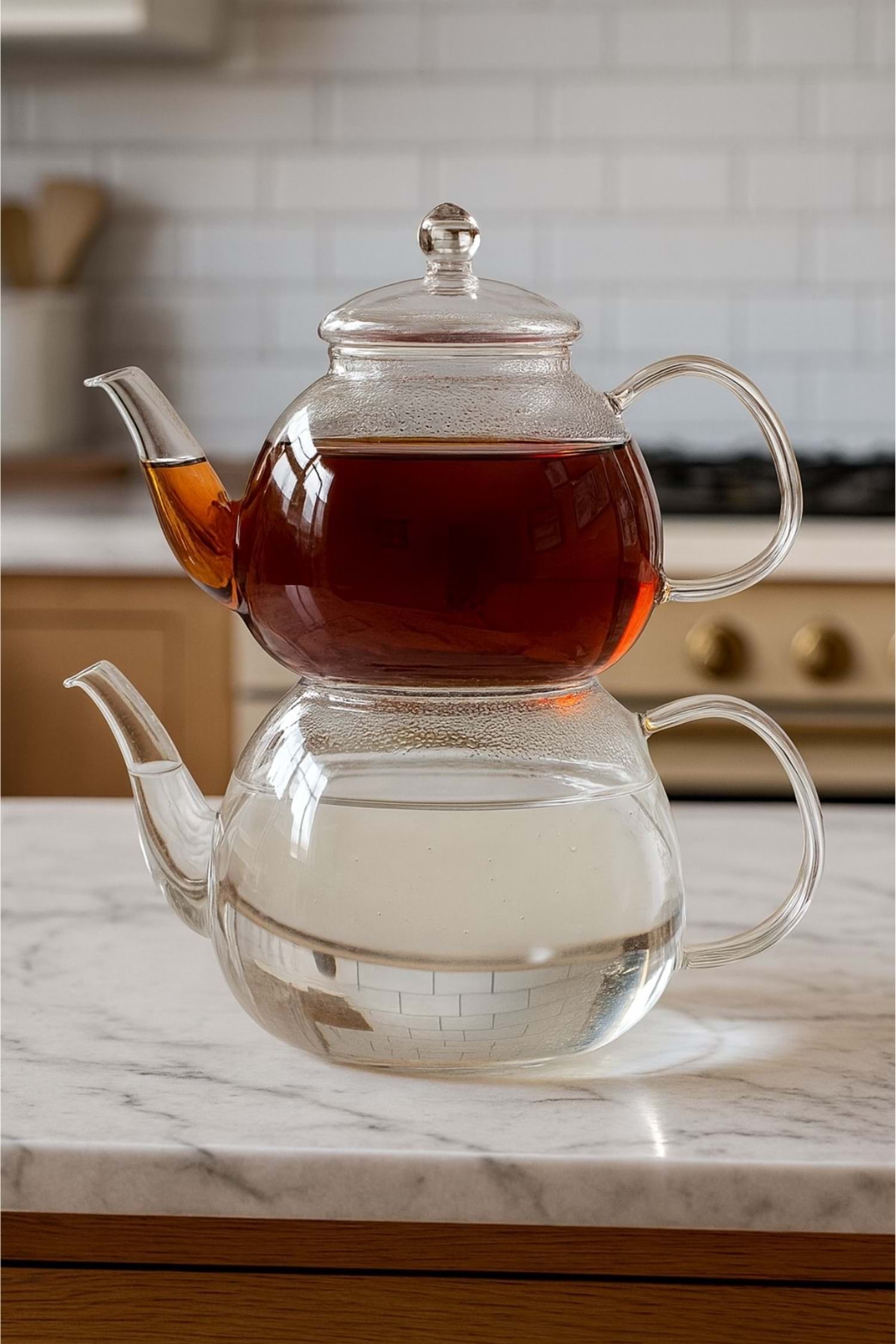 Süzgeçli Isıya Dayanıklı Cam Çaydanlık Seti – Borosilikat Cam Üst Demlik ve Alt Su Haznesi