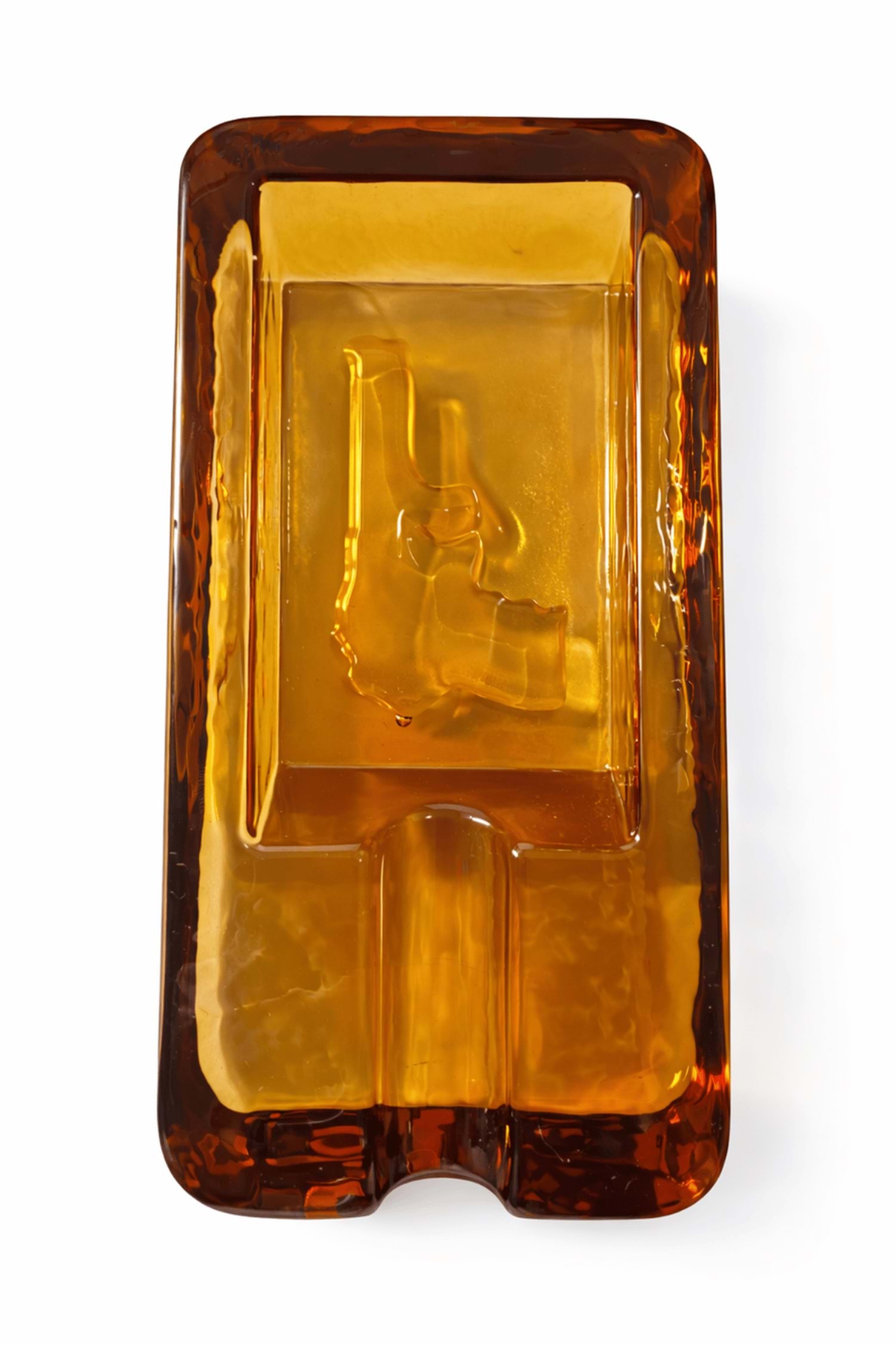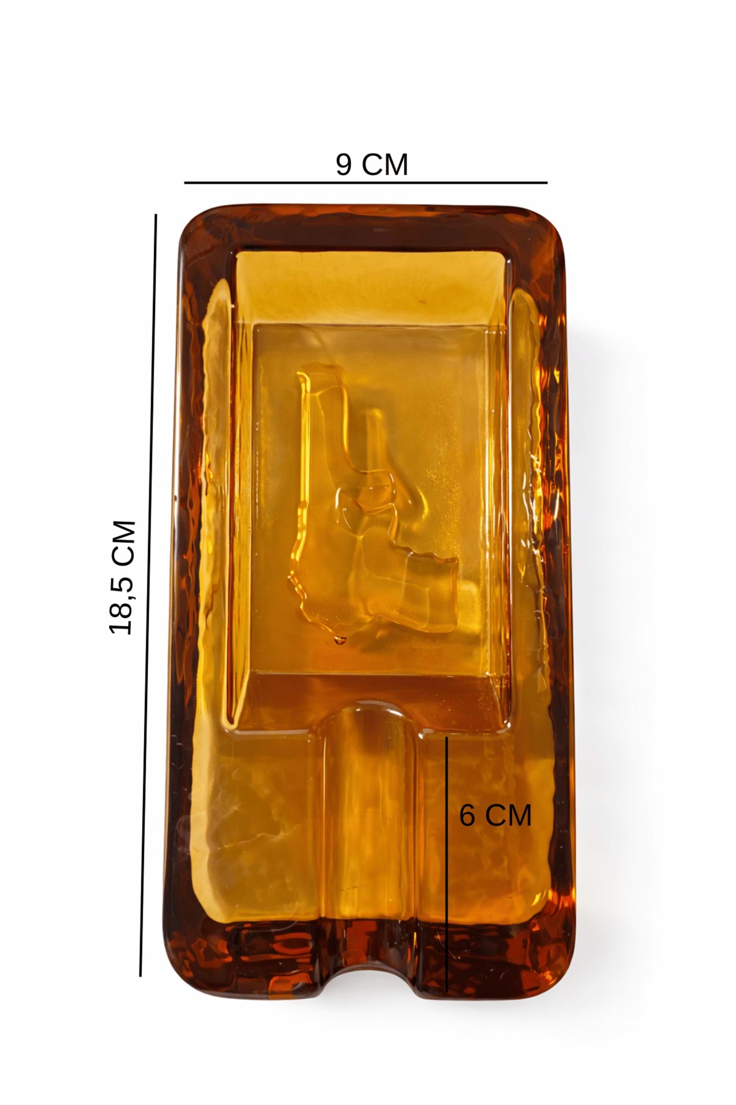 Kalın ve ağır cam gövdesi, masada dengeli ve sağlam bir duruş sağlarken; amber camın derin rengi, özellikle loş ve sıcak ışıkta göz alıcı bir görünüm sunar. Kabartma yüzey detayları, ürünü sıradan cam küllüklerden ayırarak koleksiyon değeri taşıyan bir parça haline getirir.